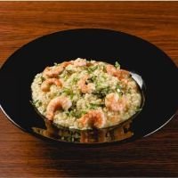 Base crocante com salmão em cubos, 4 camarões empanados, geleia de pimenta